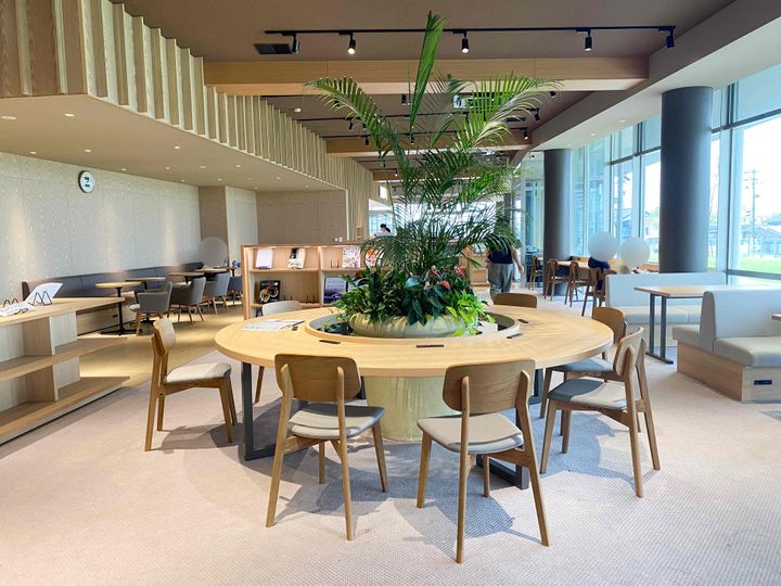 LAKUNAはくいは開業したばかりの屋内施設とあって、どこを切り取っても新しくてきれい。そんな居心地抜群の空間は、1階がカフェと図書スペースがゆるやかに繋がった図書カフェになっています。