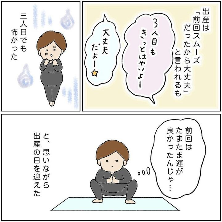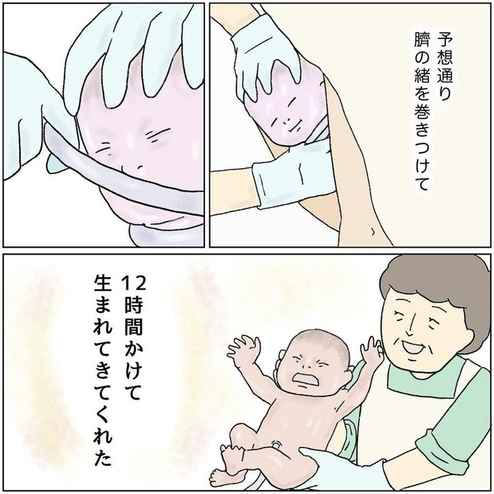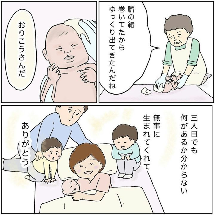 第三子は首にへその緒が巻きついていたので、12時間かけてゆっくりと産まれてきてくれました。出産はどんなに準備をしていても、予想外の事態が起こります。また同じママが産んでも、同じお産になることはありません。