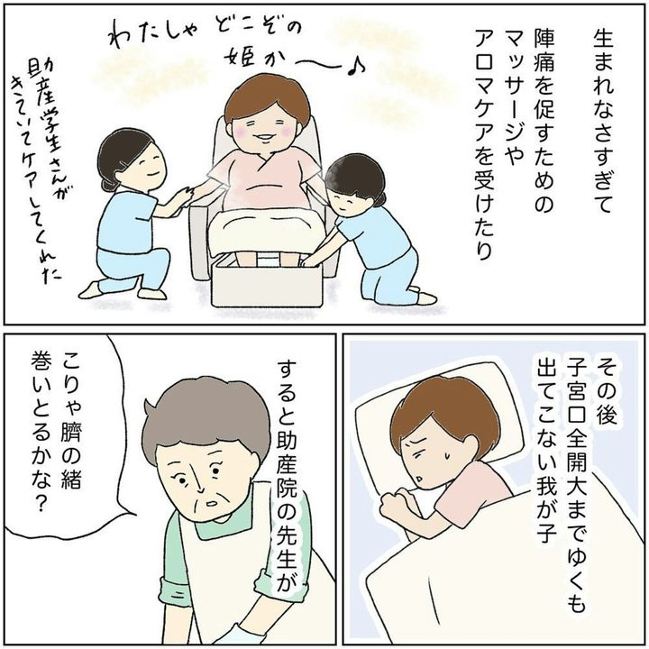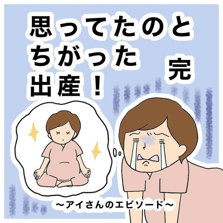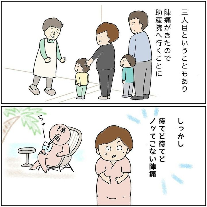 このお話は、ヨガインストラクターのアイさんの出産エピソードを紹介したエッセイ漫画です。第三子は陣痛が始まると、すぐに助産院に向かったアイさん。しかし、子宮口が全開になっても産まれてこず、12時間という長丁場でようやく出産しました。モクコ(@fufufufutago)さんによる作品『思ってたのとちがった出産!』第5話をごらんください。