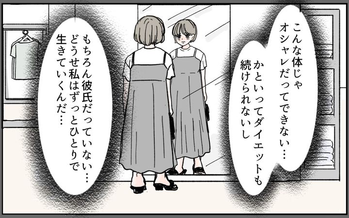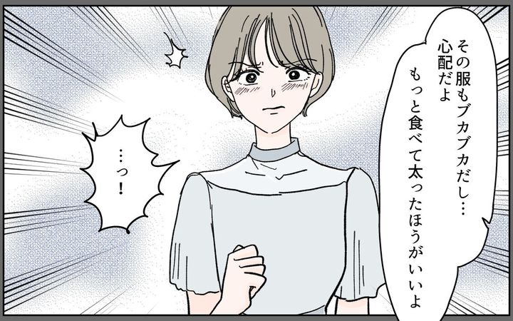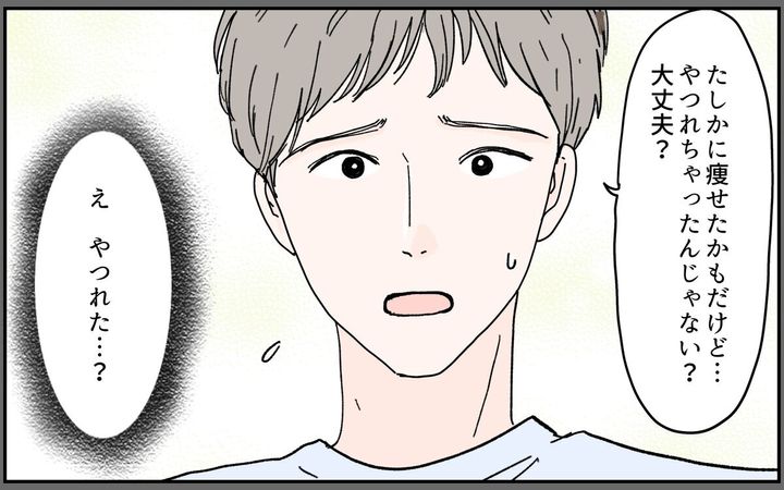 夫と出会う前の栞は、好きな服が着られない体型でした。自分には彼氏も出来ず、一人で生きていくと思っていました。そんなある日、合コンで夫と出会い結婚。出産後、いつの間にか体重が落ちていき…。栞は人生史上、一番スリムな体型に。嬉しくて「痩せたでしょ?」と夫に聞いても、「やつれちゃったんじゃない?」。そんな言葉に栞はイラっとするのでした…。