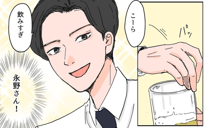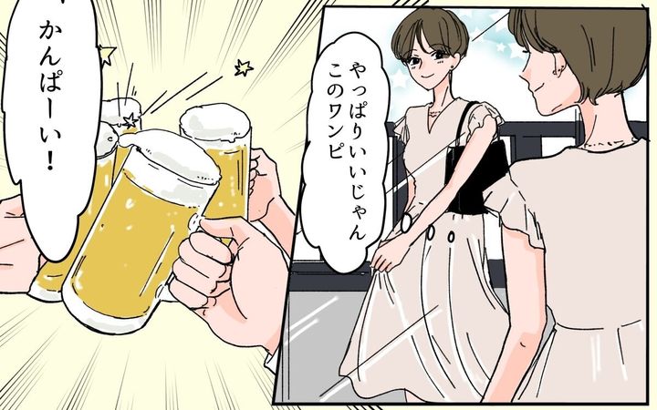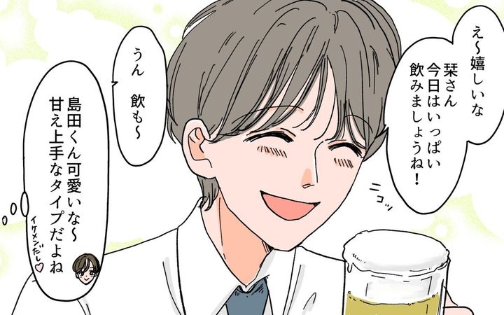 栞はオシャレをして会社の飲み会にウキウキしていました。会社の後輩や先輩、上司まで飲み会でチヤホヤしてくれるので、気分が良い栞…。