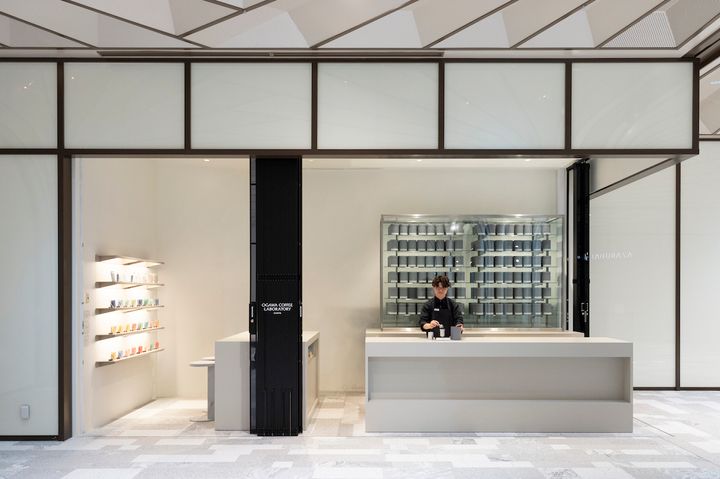 直線的なデザインとモノクロ&グレーの色味で統一されたショップは、店名にもあるようにラボラトリーをイメージ。カウンターの後ろのコーヒー豆を保管する貯蔵庫「蔵」に並ぶたくさんのキャニスターに興味がそそられます。