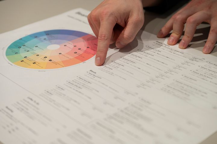 豆の特徴がわかりやすいように、この「フレーバーコンパス」という味わいチャートを見ながら豆を選んでいきます。青はすっきり、緑はさわやか、黄はまろやか、ピンクはしっかりした味わいを表していて、さらに酸味や苦味、重めか軽めかで、それぞれの豆が落とし込まれています。