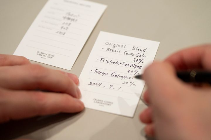 最後に、今回使った豆の種類と分量、おすすめの入れ方や豆の量、お湯の温度などをカードにまとめてくれます。村松さんの手書きの文字を見ると、このブレンドコーヒー作りの楽しい時間が思い出されそう。