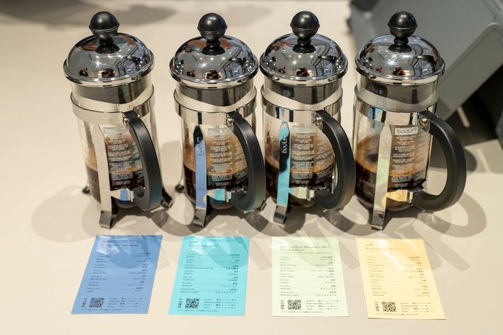 テイスティングはフレンチプレスという器具で抽出します。ハンドドリップのように紙で漉さないので、豆の持つ脂分が残りそれぞれの豆の個性をつかみやすいからだそう。