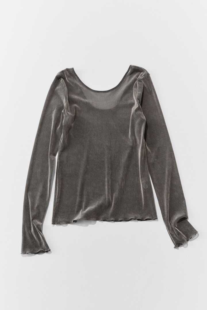 「秋も引き続き、透け感のある素材が人気。フロッキー加工がベロアのような表情に映るので、まだ少し暑い時期からでも秋のムードを取り入れられます。袖丈が長めですが、上からバングルを重ねて艶感を足せば、野暮ったくならずバランス良く着こなせます。」