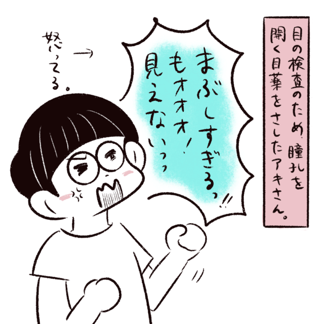 目の検査をするため瞳孔を開く目薬をさした息子。すると、「まぶしすぎるっ!!もォォォ!見えないっっ」と怒りだしました。