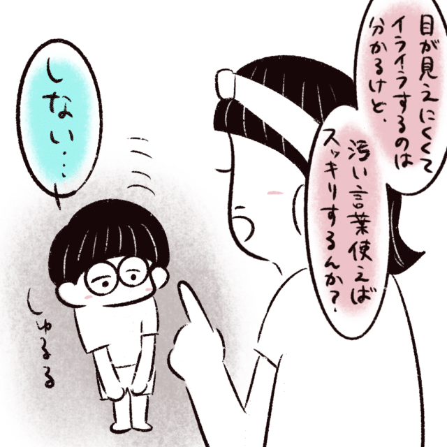 「目が見えにくくてイライラするのは分かるけど、汚い言葉使えばスッキリするんか?」私の問いかけに「しない・・・」と呟き反省した様子の息子。