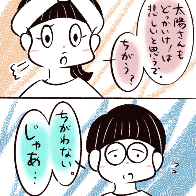 「太陽さんもどっかいけ!は悲しいと思うで。ちがう?」と聞くと、「ちがわない。じゃあ・・・」と息子も自分なりに何か考えた様子。