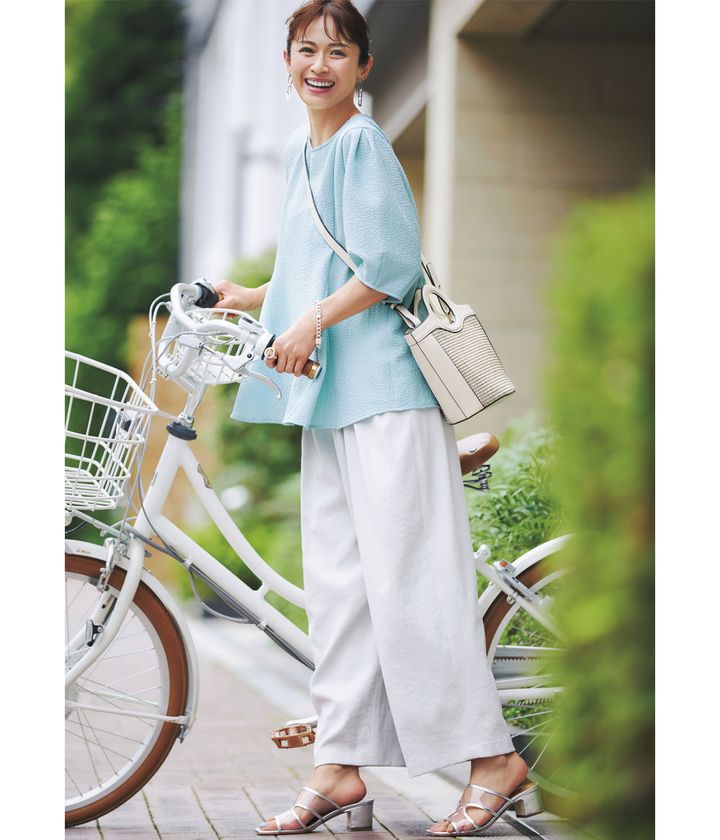 パンツ ¥16,500(N.O.R.C)ブラウス ¥4,950(OPAQUE.CLIP)バッグ ¥8,690(カシュカシュ/アンビリオン)サンダル ¥35,200(ファビオ ルスコーニ/ファビオ ルスコーニ ジェイアール名古屋タカシマヤ店)ピアス ¥11,000ブレスレット ¥23,100(ともにワンエーアールバイウノアエレ/ウノアエレ ジャパン)リング ¥23,320(バルブス/ZUTTOHOLIC)
