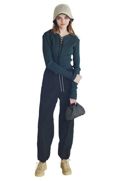 ペーパータッチな風合いとひかえめなバイカラーが、モードな見た目をあと押し。ネイビー+サンドカラーをパンツとスニーカーでそれぞれ拾うことで、ありきたりじゃないのにまとまって見える、大人のカジュアルスタイルに。
