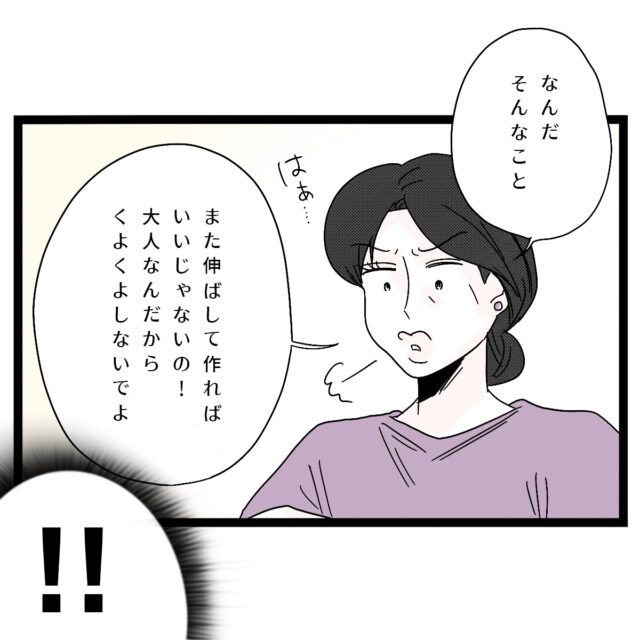 「なんだ、そんなこと。また伸ばして作ればいいじゃないの!大人なんだからくよくよしないでよ。」とお母さんは反省している様子は一切ありません。
