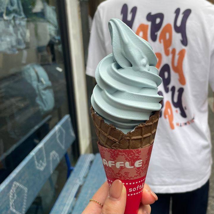 デニムストリートではデニムソフトを食べたよ〜気になる味は爽やかなラムネ風味でした!