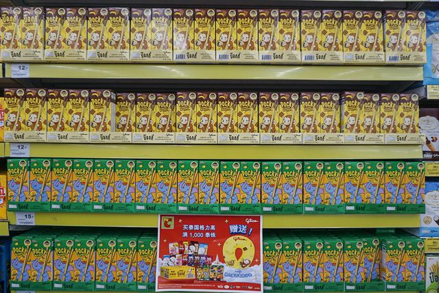 お菓子コーナーでひときわ目立っている、日本のブランド「グリコ」の人気商品「ポッキー」のコーナー。