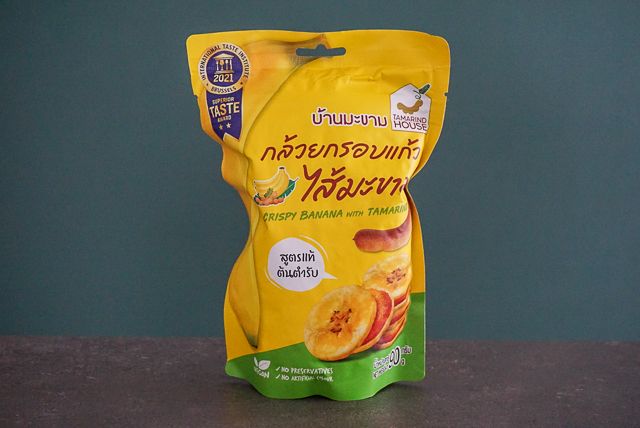 タイで定番のマメ科のフルーツ「タマリンド」を使用したお菓子(55バーツ)。甘さ控えめであっさりとしたバナナチップスに、甘酸っぱいタマリンドのペーストがサンドされています。癖がなくて食べやすく、保存料や人工着色料不使用なところもうれしいポイントです。