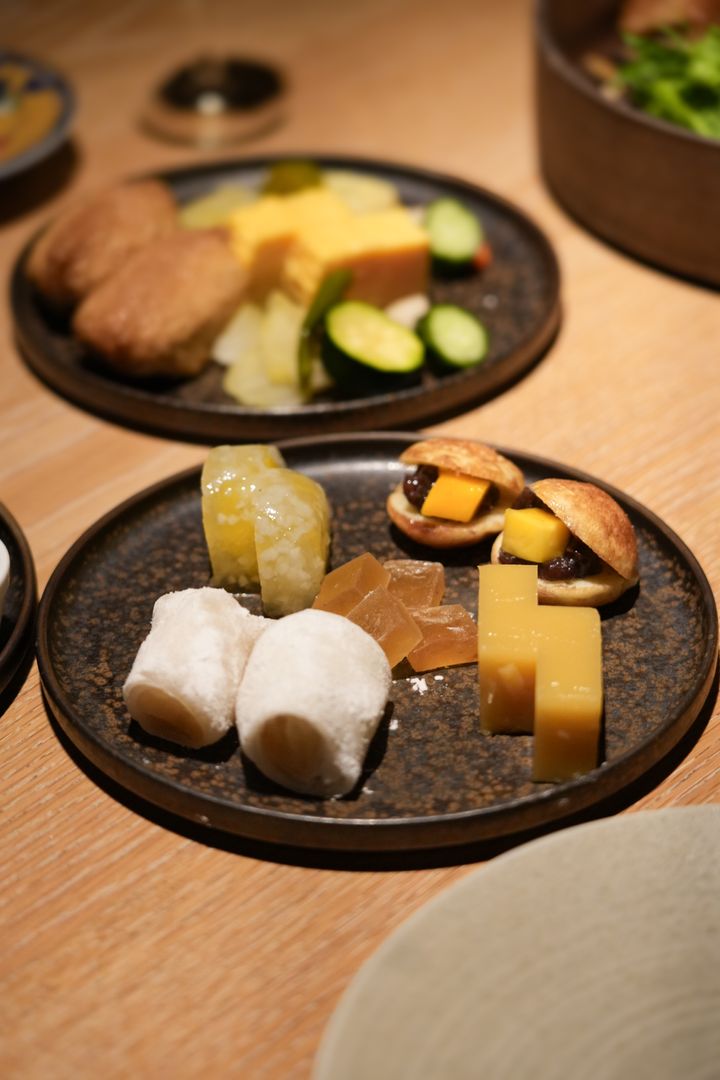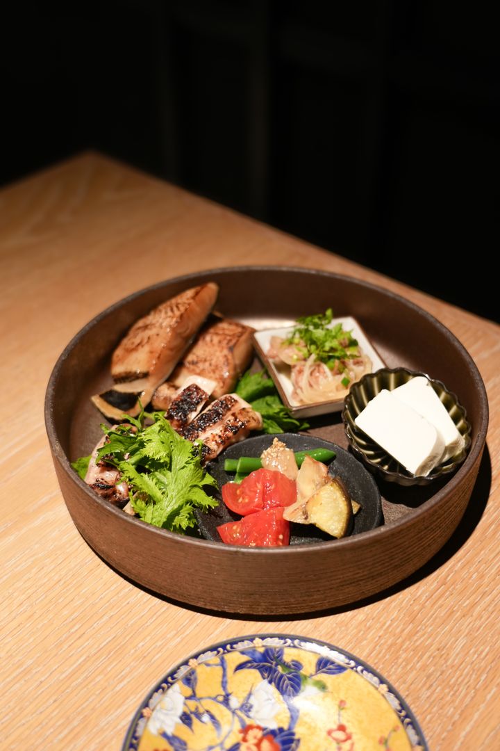 季節野菜前菜、葉月の肴物、葉月魚炙り焼き、葉月肉炙り焼き、クリームチーズ酒粕漬け