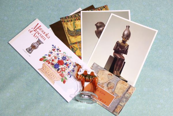 ミュージアムグッズは、唐三彩アクスタ 三彩駱駝(800円)、一筆箋 五彩花龍図瓶(450円)、古代エジプトポストカードセット(500円)を購入。 一筆箋の図柄の五彩花龍図瓶は、松岡美術館入口のガラス扉の模様になっています。