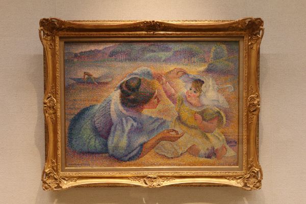 アンリ=エドモン・クロッスの《遊ぶ母と子》。色とりどりの点描が集まり表された母と子の明るい穏やかな風景。 色彩の持つエネルギーの可能性を感じさせる新印象派の作家の1人です。