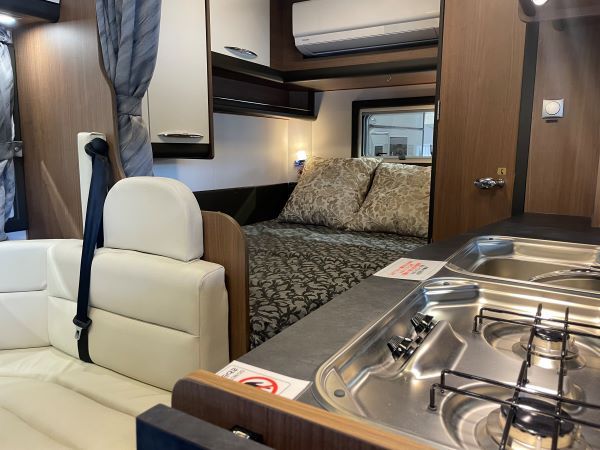 TR550L.Bolero-V.MAXの内装。 カタログには「細部までこだわった国産最上級キャブコン」と記載されています。 雰囲気は、”寝台列車の一番高価な部屋そのもの” に見えました。