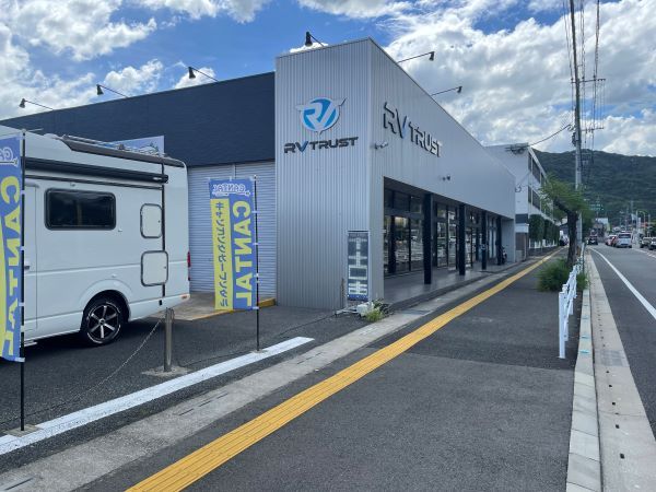 全体にシルバーの壁面に、大きなショーウインドウ、壁面にRV TRUSTの社名が掲げられており、直ぐに認識できます。