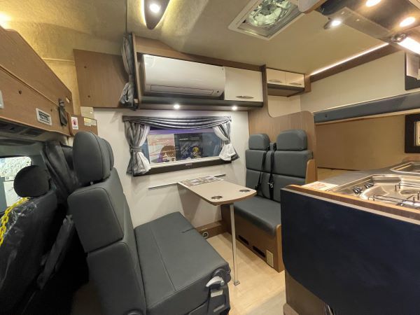 キャブコンの内装は、3車種とも共通して「ビジネスホテル」の雰囲気。 装備品も本革調のシートと、広めのテーブルを備えた応接セットが印象的です。 旅先で、今日の出来事を地図や写真を見ながら、ビール片手に団らんのひと時を‥なんて、楽しそうな場面が想像できます。