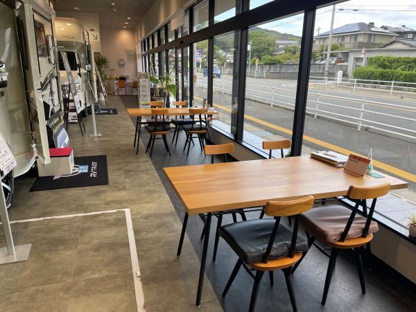 ショールームに入ると、通りに沿って4人掛けの商談テーブルが配置されています。 左手には、自慢のキャンピングカー、奥にはキャンタルというキャンピングカーのレンタカーの窓口があります。 キャンピングカーの車高が3m近くあるので、天井も高くゆったりしたショールームです。