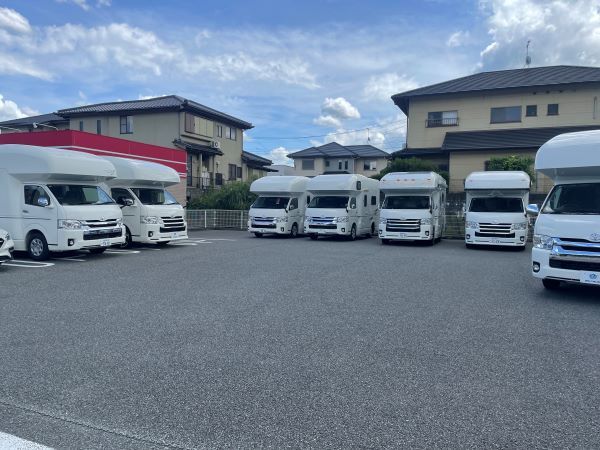 ショールームの隣には広大な駐車場が設けられており、RV TRUST社自慢のキャンピングカーが多数駐車しています。 これだけの台数のキャンピングカーを一度に見ることが無いので、圧倒されます!