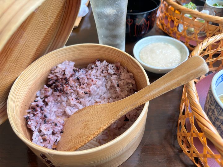 おひつで黒米を持ってきてくださるので、少しずつ自分でよそって楽しめます。