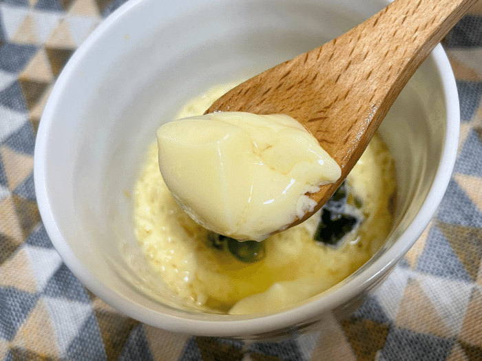 三度目の正直としてできあがったのはこちら! 表面が少しぼこついてしまいましたが、失敗したときよりは茶碗蒸しっぽくできあがっているので、成功を願って青ネギだけ散らしてみました。