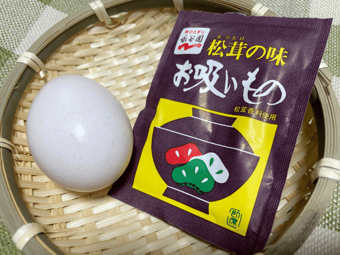 用意する材料はこちら、卵(Lサイズ)と永谷園の「松茸の味お吸いもの」の2つだけ。あとは、ぬるま湯と電子レンジがあればOKです。永谷園の公式レシピだと、これに加えて鶏ささみ肉、しいたけなどの具材が書かれていますが、今回はお腹が空いたときにあるもので作れるという自分内のコンセプトがありましたので、極力材料は使わないシンプルな茶碗蒸しを目指したいと思います。