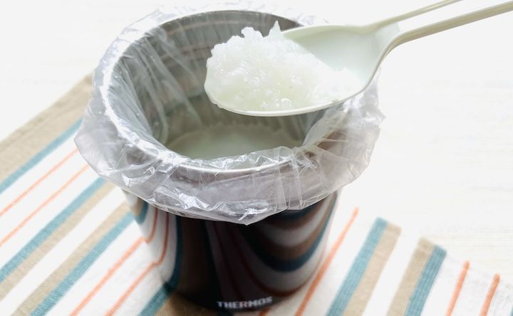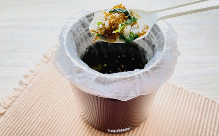 水の使用が制限される災害時などの緊急時のみですが、スープジャーにポリ袋をかけて調理すると、洗い物が減るのでおすすめだそうです。