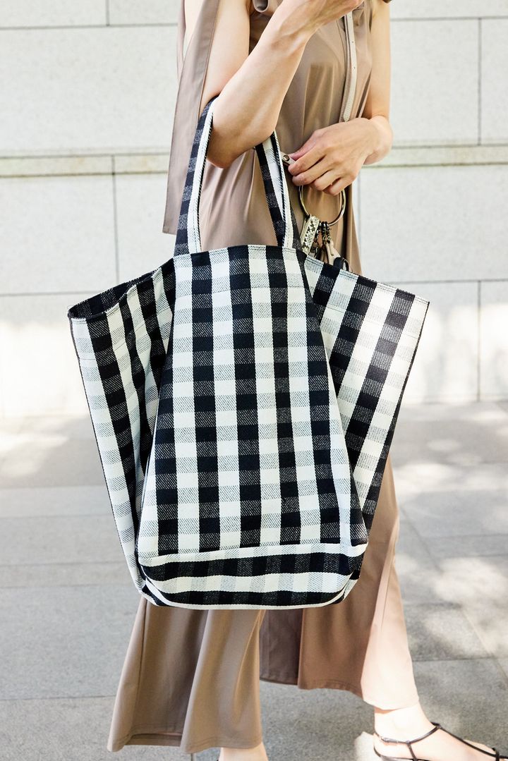 大きめマザーズバッグも 「白黒チェック」なら コーデを邪魔せず使えます