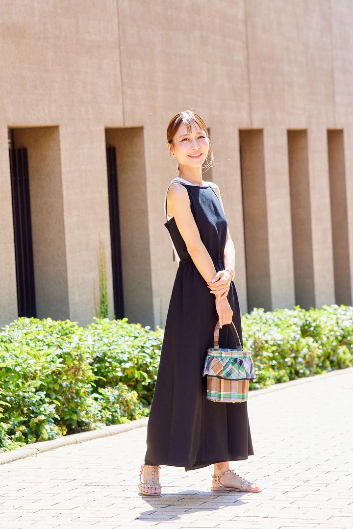 「夏のシンプル服に合わせたいと思って購入したバッグは肩掛けもでき、子連れのお出かけにも使いやすいです。貴重品はしっかり入りつつも主張しすぎない大きさで、ブルーベースだからか、色×チェックの組み合わせでも大人っぽく持てます」野田尚伽さん・153cm(歯科医師/3歳男の子・6カ月のママ)