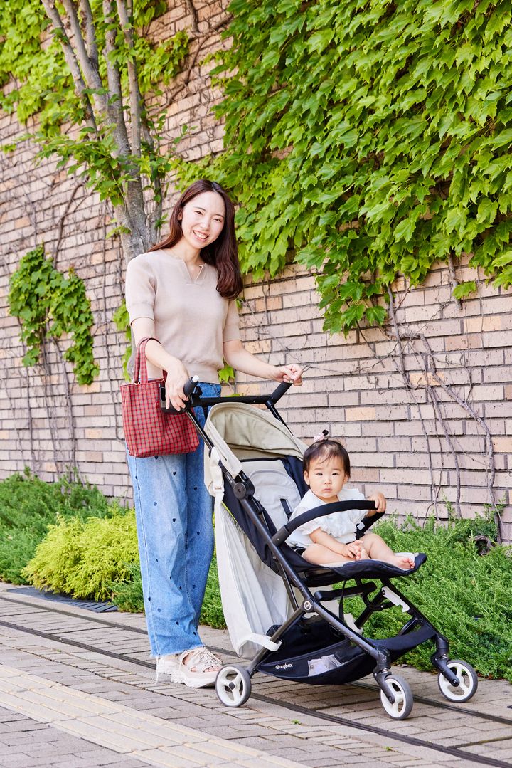 「子どもが産まれたら購入したいと思っていたファミリアの定番チェックバッグ。実際に使ってみると水に濡れても気にならず、ママバッグとしての使い勝手がバツグンでした。ご近所コーデでもこのバッグを合わせるだけで華やかさがアップするので、買い物シーンにも活躍しています」岩本香菜子さん・166㎝(3歳と1歳の女の子のママ)