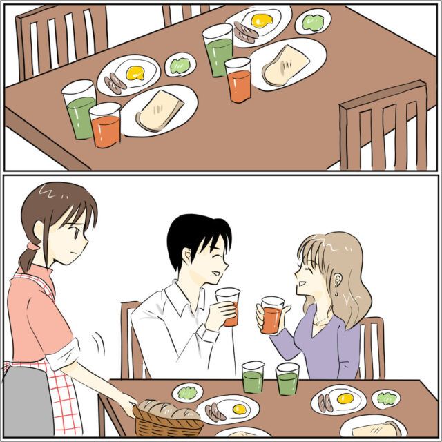 食卓に2人分の朝食を並べると、当然のようにタクマさんの隣にユウコさんが座り、楽しそうに仲良く朝食を食べ始めました。恋人同士のような夫とユウコさんの朝食が終わるまで、私はお手伝いさんのように世話をしていました。夫はこの状況がとても満足そうに見えましたし、私の代わりのはずのユウコさんはまるで立場が逆転したかのようにタクマさんの傍で笑顔で座って私の事は見えていないようでした。