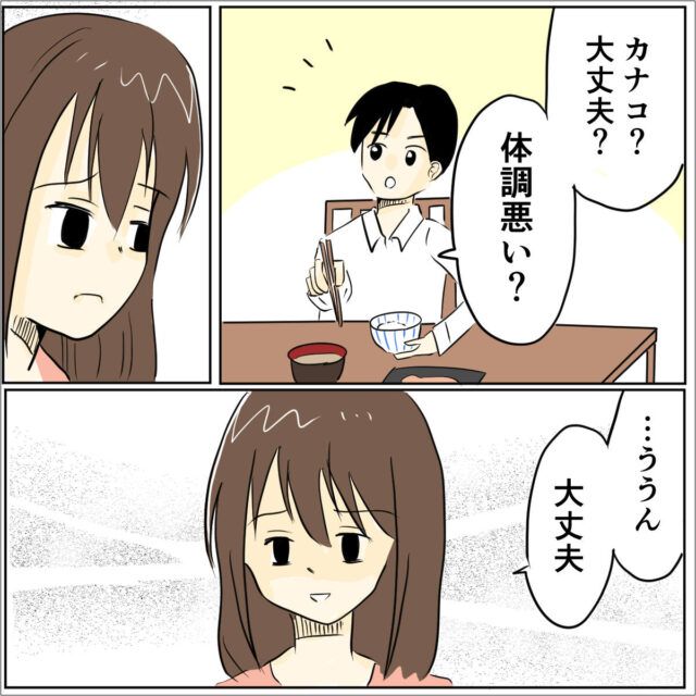 楽しそうに2人で会話しながら、私が作った夕食を食べている夫とユウコさん。何とも言えない気持ちになっていました。すると夫が「カナコ?大丈夫?体調悪い?」と声をかけてくれました。優しい言い方。でも気遣っている言葉を並べているだけで、夫は全く分かっていません。「ううん、大丈夫。」と答えるのが精一杯でした。