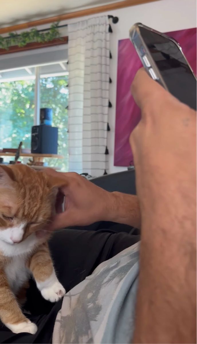 その時、パパさんの膝の上でナデナデしてもらっていたティンビッツ。 ご満悦な時間を過ごしているようです。