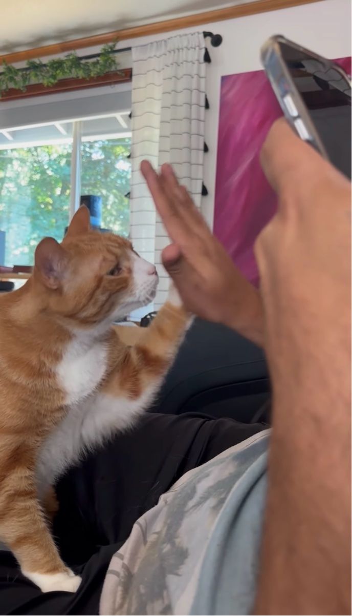 パパさんが差し出した手にちょこんとおててを重ねたネコ。 上手にハイタッチできたご褒美は、大好きなナデナデでした!!