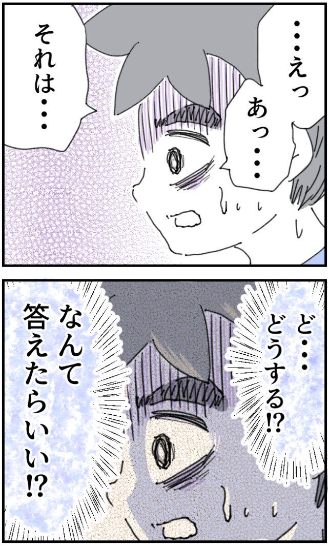 「まさか・・『その女の仕事を手伝ってた』なんて言わないよね・・?」かおりさんに真っ直ぐ目を見てたずねられたいちろうさん、「・・えっ、あっ・・それは・・」と言葉に詰まりながらも頭の中に思いが駆け巡ります。「なんて答えたらいい?あの時帰れなかったのは、白石ちゃんの仕事を代わりにやってたからなんだ!!かおりが一人で苦しんでたり、育児がこんなに大変だなんて思ってもみなかったから!!」過去の自分自身を反省するいちろうさん、「けど、それを正直に話したら本当に何もかも終わっちゃうかもしれない・・!!それだけは・・嫌だっ!!」そして「あ・・あの時は、大きなプロジェクト担当者が・・急に辞める事になって人手が・・」いちろうさんがかおりさんに話し始めました。