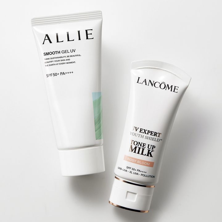 左:艶 やかな肌に。アリィー クロノビューティ スムースジェルUV SPF50+・PA++++ UV 耐水性★★ 60g ¥2,310 ※数量限定<編集部調べ>(カネボウ化粧品)右:血色感もプラス。UV エクスペール トーン アップ ローズ N SPF50+・PA ++++ 30ml ¥7,480(ランコム)