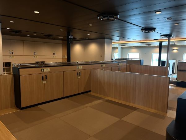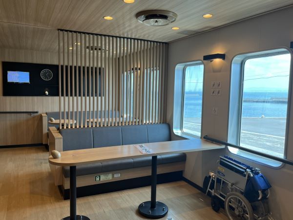 エレベーターの前に、写真の広々としたスペースが設けられています。優先マークが付いていたりテーブルには「車椅子優先」と示されており、優先席であることがわかりやすくなっているのがいいなと思いました。すぐ近くにはバリアフリートイレや売店があります。足の悪い祖母などもこのフェリーなら乗船しやすく、一緒に船旅を楽しめそうです!