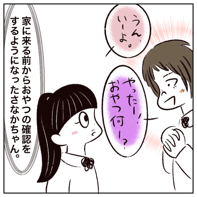 「うん、いーよ」まるさんが答えると「やったー!おやつ何ー?」さなかちゃんは家に来る前からおやつの確認をするようになりました。