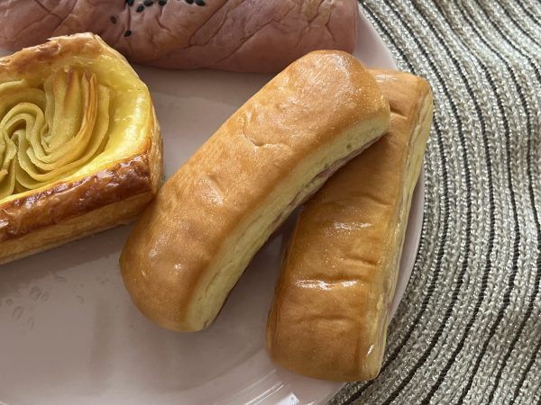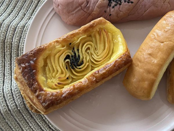 タルト×デニッシュの生地が新しいパン。生地の上には、カスタードと紅あずまの焼き芋ペーストを使用したスイートポテトをたっぷり絞っています。