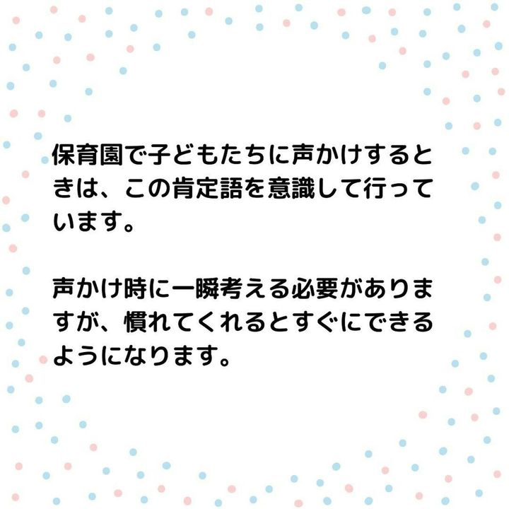 たくさんの子どもを相手にする保育士さんは、このような肯定語を使った声掛けを意識しているそうです。慣れるまでは脳内で変換作業が必要ですが、だんだんと肯定語が自然と出てくるようになります。