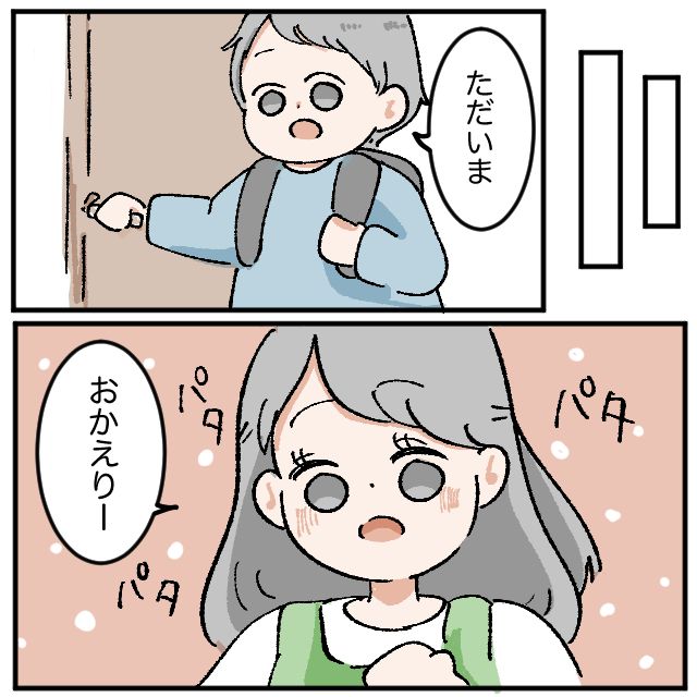 「ただいま」学校から帰ってきたアサヒくん、「おかえり-」ママは急いで玄関に行き出迎えました。