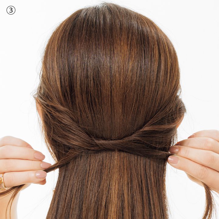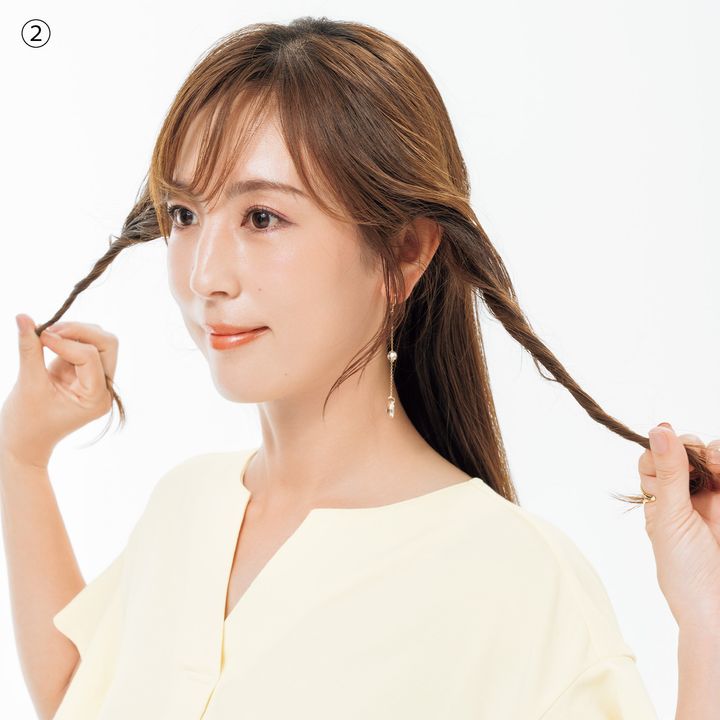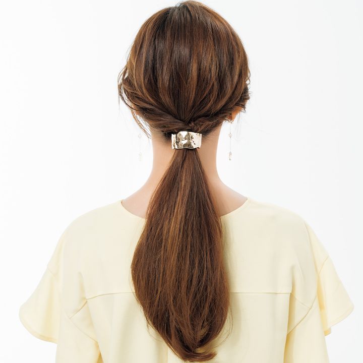 ひとつ結びにしたゴムの上に重ねるだけで、ゴムをまるっと隠せるヘアアクセ。アレンジが一気に格上げされて、おでかけ仕様にチェンジ。今回、大谷さんは2を使用。