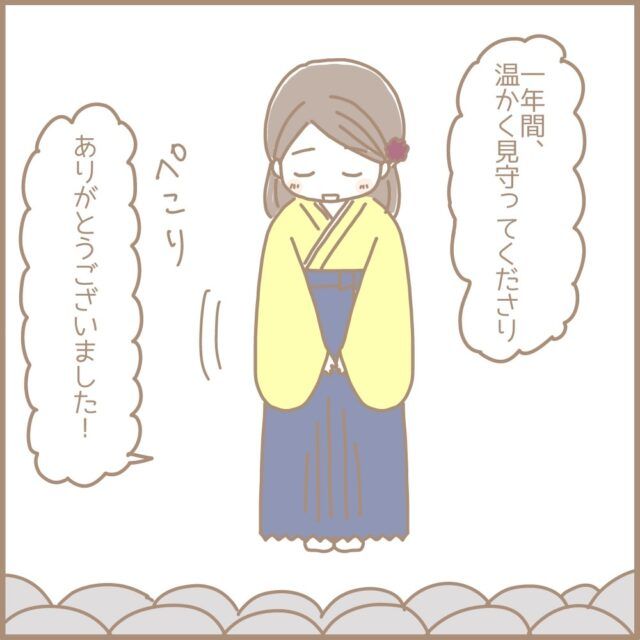 「子どもたちが大好き」という強い気持ちで経験の無さをカバーしてきた幼稚園教諭1年目のまるちゃんさん。その気持ちはきっと子ども達にも保護者のみなさんにも伝わっていたと思います。卒園式を終えたまるちゃんさんは、やり切ったという達成感に満ちていますね。