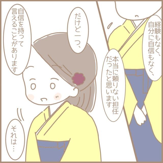 新卒1年目でまるちゃんさんが担任を受け持った年長クラスすずらん組の卒園式が無事に終わり、教室ではまるちゃんさんから最後の挨拶がはじまりました。すずらん組になって最初の日のことから振り返りながら子ども達に語りかけるまるちゃんさんは、みんなとお別れするのが寂しくていっぱい泣いてしまったけど、みんなのことを応援したいからもう泣くのはやめると笑顔で伝えました。続けて保護者に向けて、頼りない担任だったけれど自信を持って言えることがある、と話し始めます。