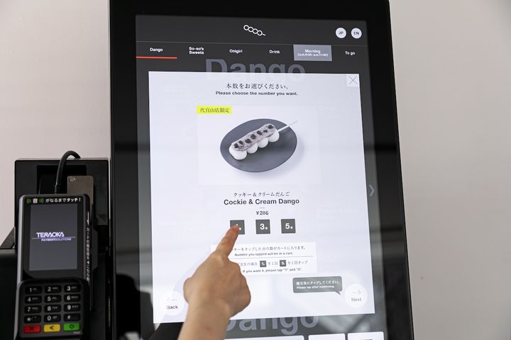 オーダーは、入ってすぐのところにあるディスプレイから。最初の画面で「イートイン」か「TO GO(持ち帰り)」のどちらかを選択すると、メニューが見られます。支払いはキャッシュレスのみなので、クレジットカードまたは決済アプリを用意しておきましょう。