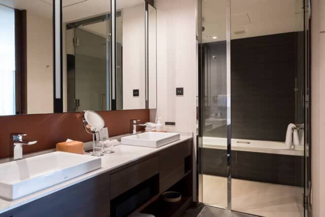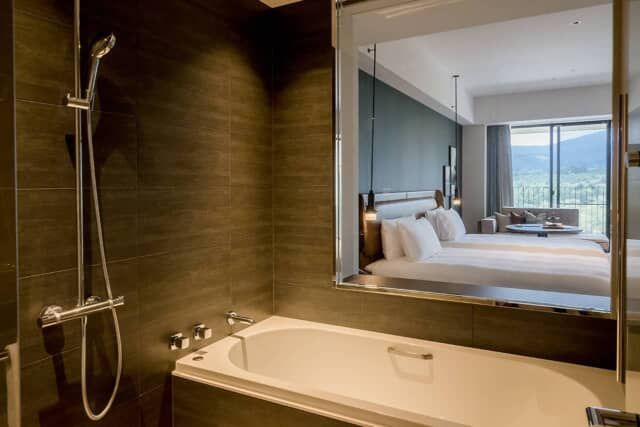 深めのバスタブとレインシャワーを備え、静岡茶を配合した入浴剤も用意。シャワールームからはガラス越しにベッドルームと外の景色が見られます。